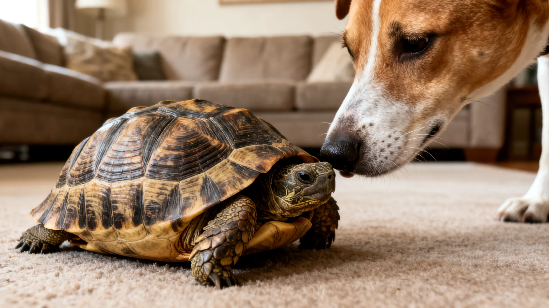 Besonders kritisch wird die Situation, wenn Schildkröten mit Hunden oder Katzen den Lebensraum teilen müssen. Was für uns Menschen wie harmloses Interesse unserer Vierbeiner aussieht, bedeutet für eine Schildkröte puren Überlebenskampf. Ihr Instinkt sagt ihr: Raubtier in Sichtweite.